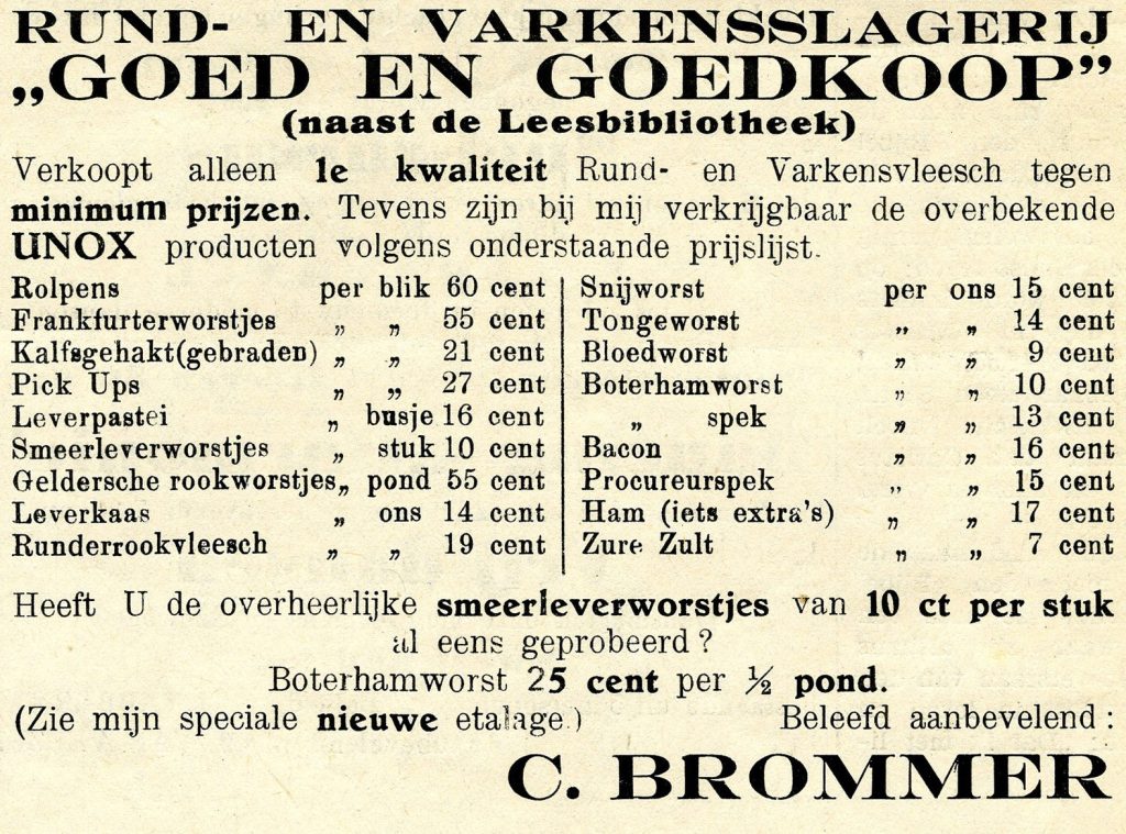 Voor de Tweede Wereldoorlog kwam er toch een slager in één van de winkelpanden, C. Brommer. Hij zat op nummer 115a, de linkerwinkel bij de poort. Na de oorlog heeft F.M. Scholten deze zaak overgenomen, na de laatste renovatie verhuisde de slagerij, toen al jaren bestierd door zijn zoon Rien, naar het winkelpand aan de oostzijde van het complex. Dit is uiteindelijk ook een woning geworden.